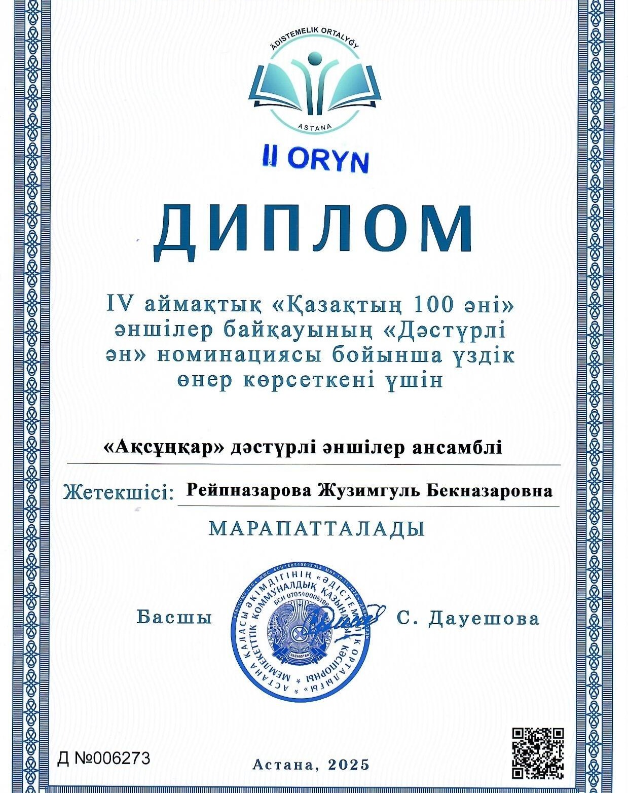 27 наурыз күні Астана қаласында өткен республикалық IV аймақтық «Қазақтың 100 әні» әншілер байқауының «Дәстүрлі ән» номинациясы бойынша үздік өнер көрсеткені үшін «Ақсұңқар» ансамблі ІІ орынды иеленді.