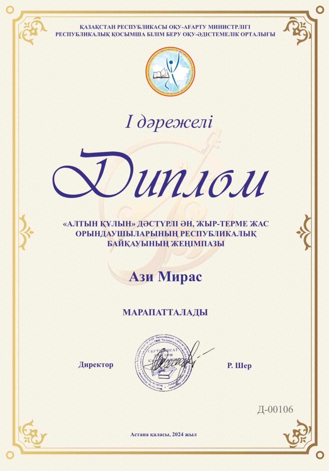 «Алтын құлын» дәстүрлі ән, жыр-терме жас орындаушыларының республикалық байқауы бойынша… Наурыз 11, 2024 Наурыз 11, 2024 «Алтын құлын» дәстүрлі ән, жыр-терме жас орындаушыларының республикалық байқауы бойынша Ази Мирас және Жұлдызбай Жомарт І орынды иеленді.Мұғалімі: Жузбаева Назгуль Кенжебаевна