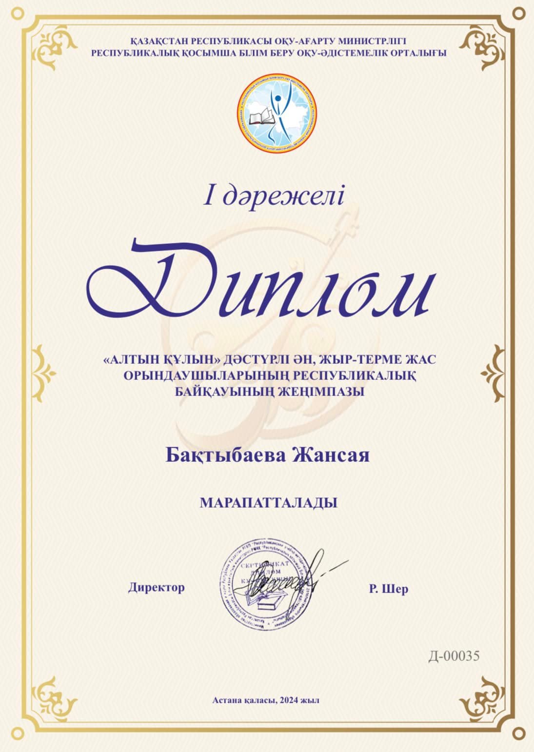 «Алтын құлын» дәстүрлі ән, жыр-терме жас орындаушыларының республикалық байқауы бойынша Бақтыбаева Жансая І орын, Бахтығалиұлы Аян және Сандешова Элеонора ІІ орынды иеленді.