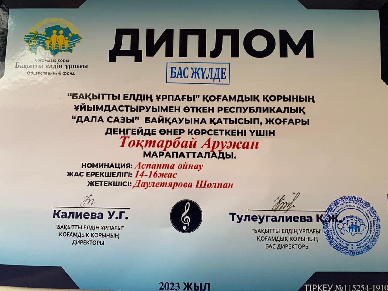 “Бақытты елдің ұрпағы” қоғамдық қорының ұйымдастыруымен өткен Республикалық “Дала сазы” байқауына “Фортепиано”номинациясы бойынша
