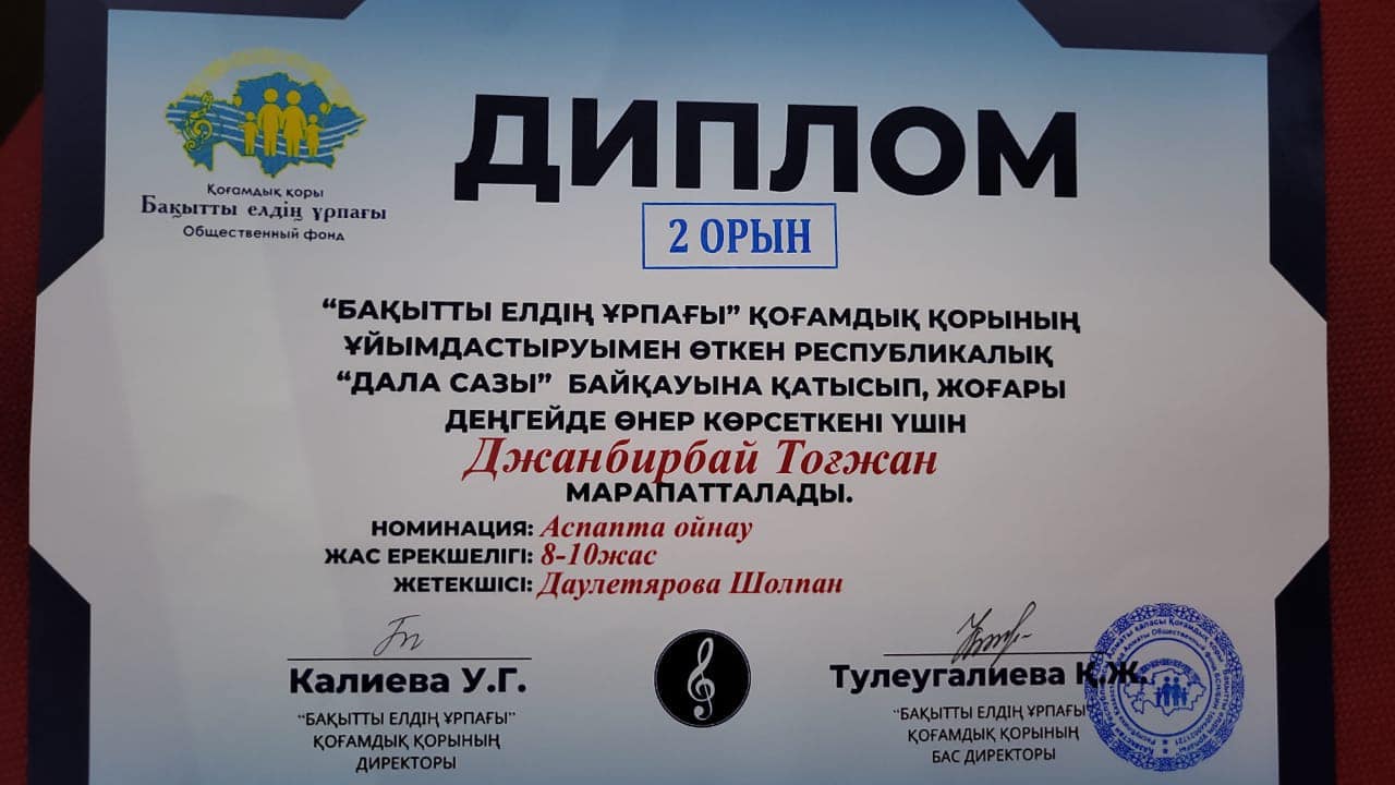 “Бақытты елдің ұрпағы” қоғамдық қорының ұйымдастыруымен өткен Республикалық “Дала сазы” байқауына “Фортепиано”номинациясы бойынша