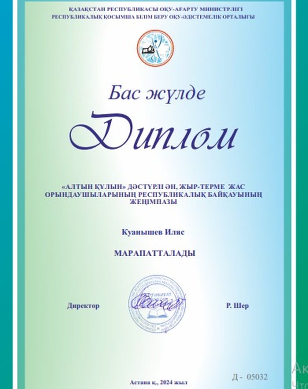"Композитор Н.Тілендиевтің 100 жылдығына арналған "Біз отанның ұланымыз" республикалық байқауы бойынша Куанышев Иляс және Қартмағамбет Ақсезім Бас жүлдеге иеленді.