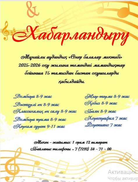Жаңа 2025 – 2026 оқу жылына Мұнайлы ауданы бойынша білім бөлімінің «Өнер балалар мектебі» төмендегі мамандықтар бойынша 15 тамыздан бастап оқушыларды қабылдайды. Байланыс телефоны: + 7 (7292) 34 – 71- 00