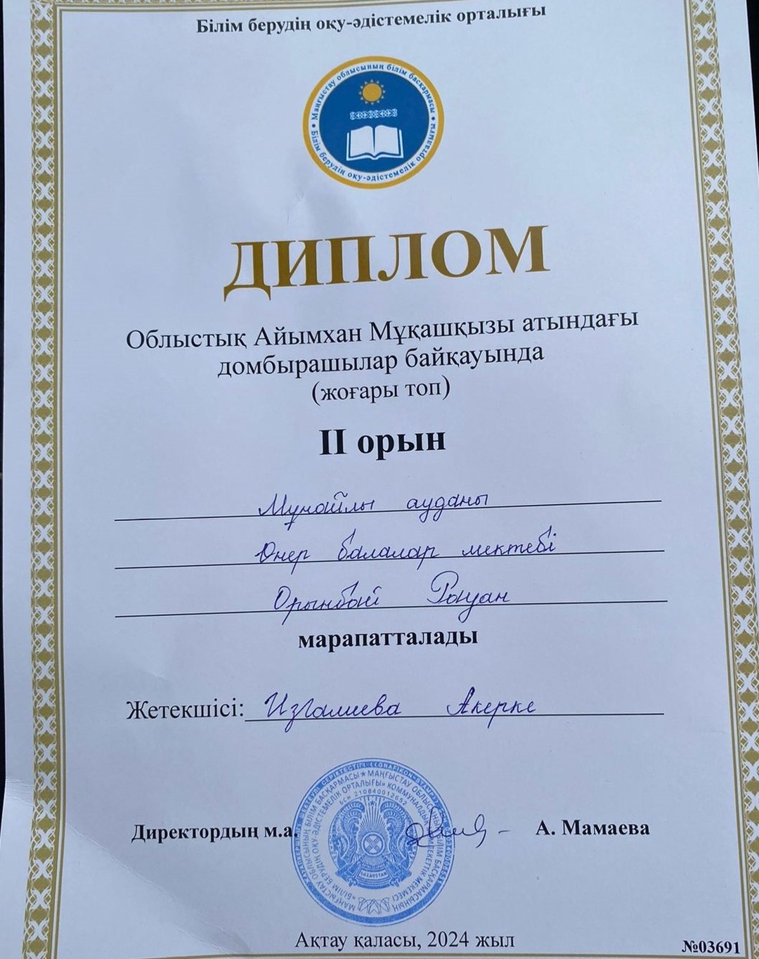 2024 жылдың 15 қараша күні Облыстық білім берудің оқу-әдістемелік орталығының ұйымдастыруымен Облыстық Айымхан Мұқашқызы атындағы домбырашылар байқауында (жоғары топ) арасында Орынбай Рауан ІІ орынға иеленді.