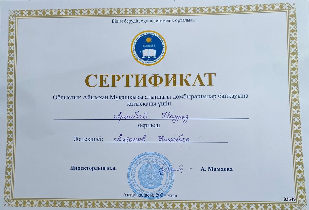 2024 жылдың 15 қараша күні Облыстық білім берудің оқу-әдістемелік орталығының ұйымдастыруымен Облыстық Айымхан Мұқашқызы атындағы домбырашылар байқауы бойынша Аралбай Наурызға сертификат табысталды.