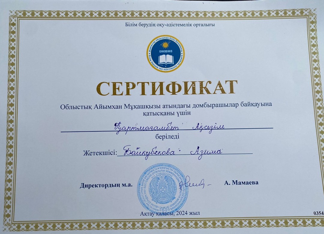 2024 жылдың 15 қараша күні Облыстық білім берудің оқу-әдістемелік орталығының ұйымдастыруымен Облыстық Айымхан Мұқашқызы атындағы домбырашылар байқауы бойынша Қартмағамбет Ақсезім сертификат табысталды.