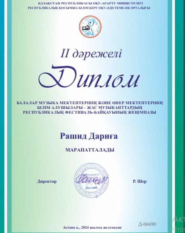 Балалар музыка мектептерінің және өнер мектептерінің білім алушылары – жас музыканттардың республикалық фестиваль- байқауына қатысқан Рашид Дариға ІІ орынды иеленді.