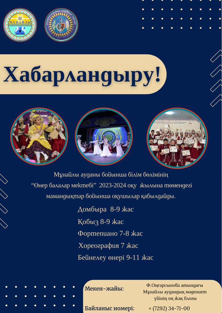 Маңғыстау облысының білім басқармасының Мұнайлы ауданы бойынша білім бөлімінің «Өнер балалар мектебі» жедел басқару құқығындағы мемлекеттік коммуналдық қазыналық кәсіпорны Жаңалықтары Қыркүйек 21, 2023 Қыркүйек 21, 2023